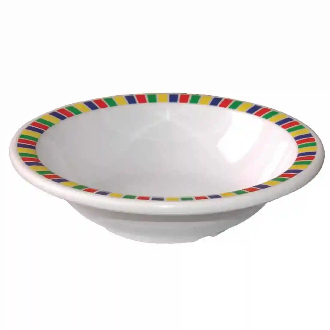 For a hygienic and durable alternative to china, our Olympia Kristallon melamine Fairground range bowls are the perfect crockery for use in schools, nursing homes and other establishments. Melamine is a durable, scratch and chip resistant plastic which is lightweight, and this range has a colourful patterned rim.