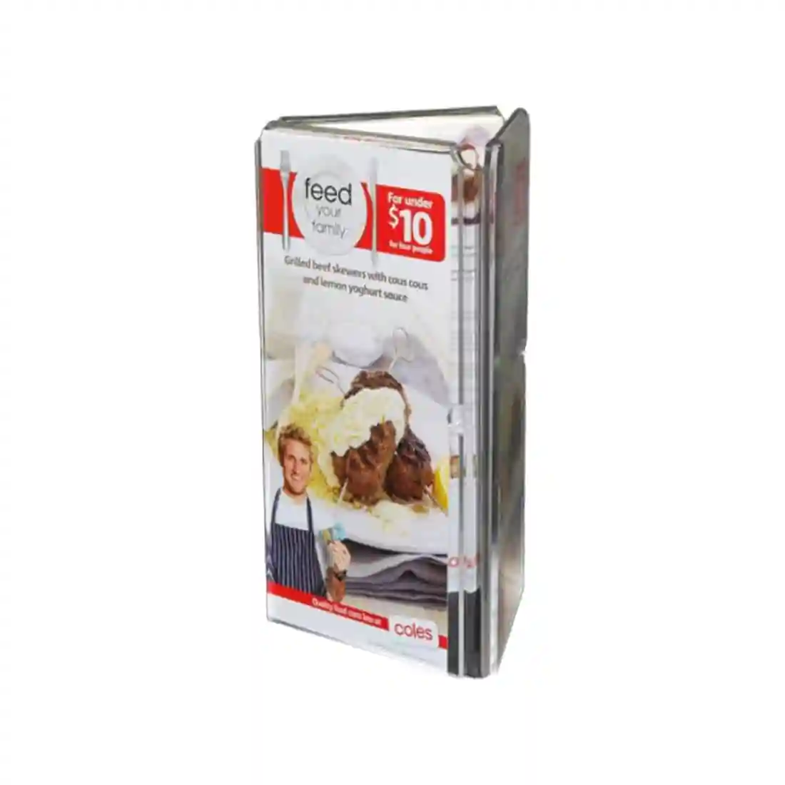 Triple-sided acrylic holders are available in various sizes and shapes, accommodating different menu dimensions and design preferences offering flexibility to match your branding and ambience.Effortless Updates