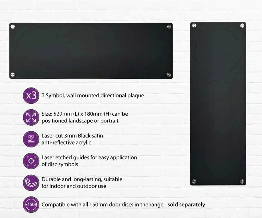 Designed to accommodate the 150mm washroom and directional discs (sold separately), this plaque is a suitable and complementary addition to guide visitors effectively. The dimensions of 529mm (L) x 180mm (H) position it perfectly for landscape orientation, allowing for clear visibility of the symbols and directions.