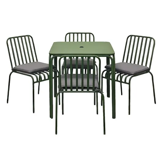 Outfit your outdoor space with this jade green metal dining set from Tenby. Built to endure with a contract-quality construction, it’s perfect for high-traffic areas like pub gardens, cafe courtyards or restaurant patios. The set comprises a square dining table and four comfortable, stackable dining chairs with grey seat cushions. Its strong, rust-resistant powder-coated steel frame ensures it can withstand the elements, making it ideal for year-round use.