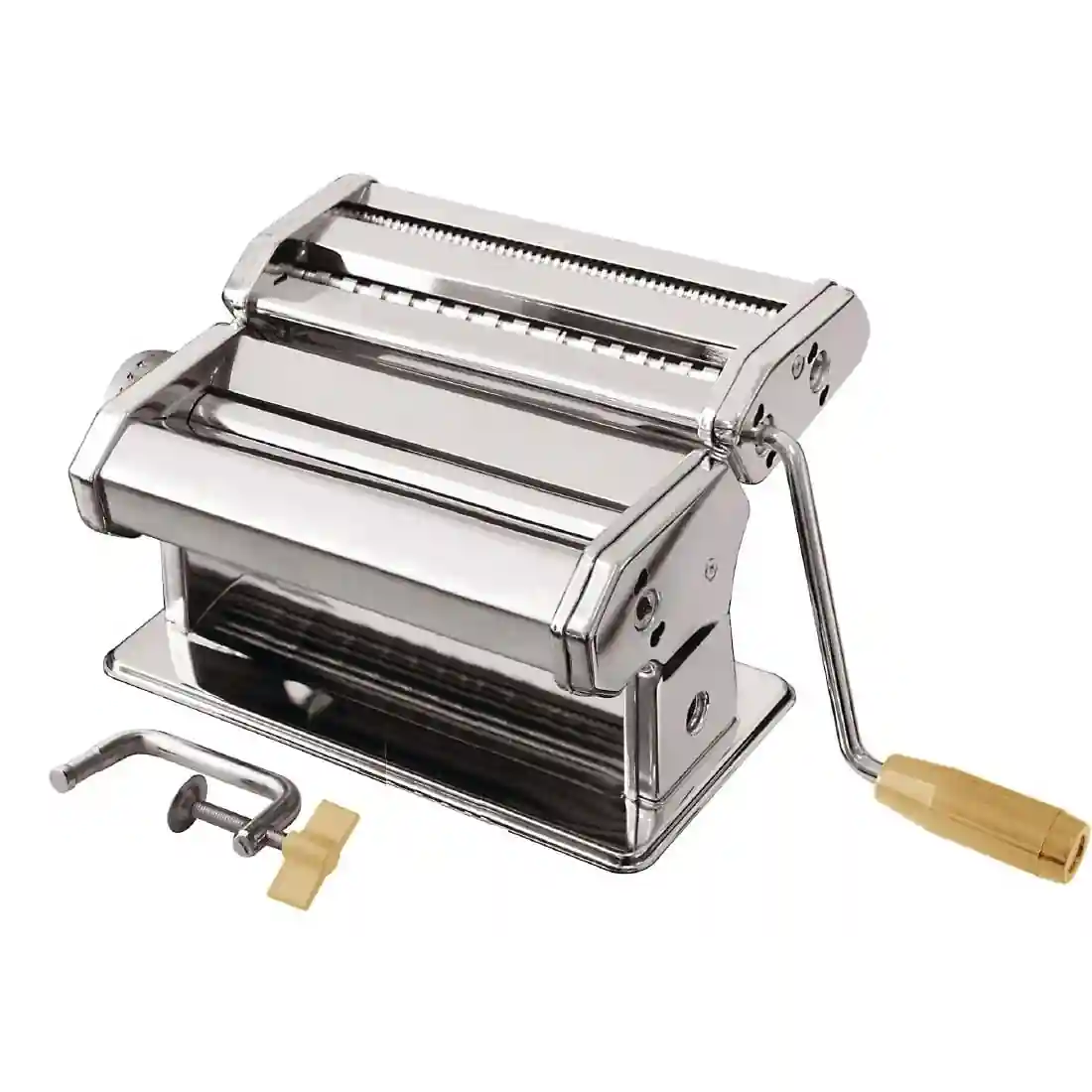Chrome plated steel pasta maker with nickel plated rollers. Dough can be made in various thicknesses and two widths.