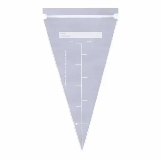 Disposable pastry bag with zipper, made of CPP, crystal clear, graduated, lettering field and zipper to close.