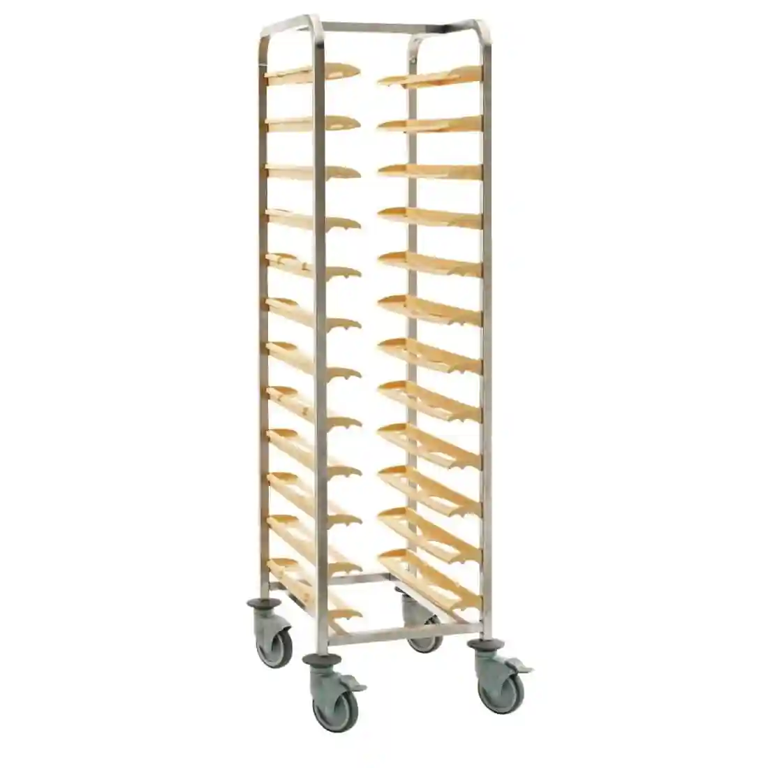 Trolley with plastic shelf supports for 12 trays (up to 530 x 370mm). Shelf spacing 108mm. Max load per shelf 5kg.