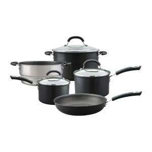 Includes: 160mm Saucepan, 180mm Saucepan, 200mm Saucepan, 250mm Skillet, 200mm Steamer Insert. Anodised aluminium. Induction compatible. Lids included. Non-stick