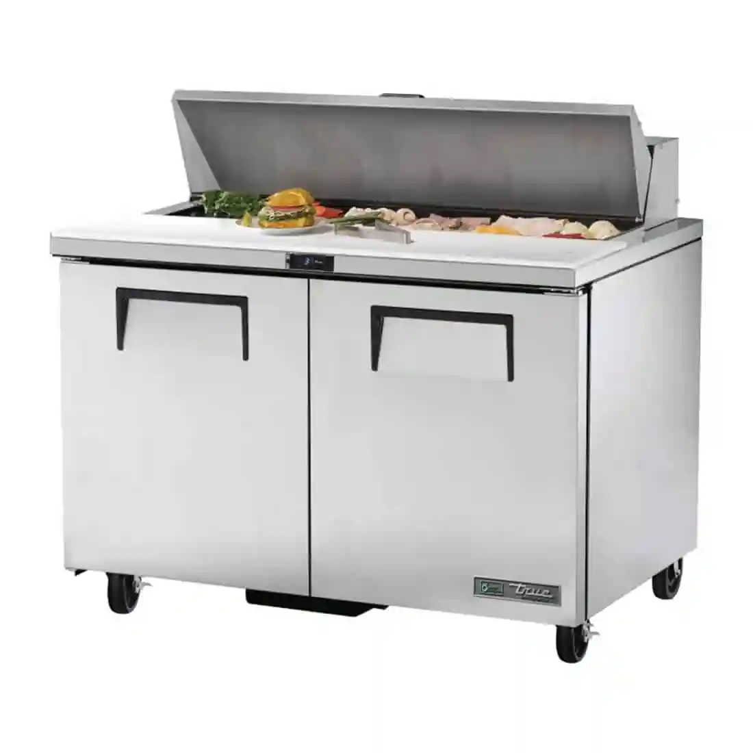“Whether you’re making salads or sandwiches, the True two door prep counter ensures your food is kept at the perfect temperature to keep it fresh. With a handy slide-down lid, the food is hygienically stored, keeping pests and bacteria away. The counter also includes a convenient chopping board – perfect for preparing food directly in front of your customers in salad bars, sandwich shops or pizzerias. Supplied with 12 1/6th size GN pans.
