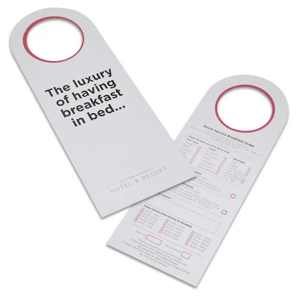Printed Hotel Room Door Hangers are essential for guests privacy and housekeeping organisation. They are a handy tool utilised by hotels, B&Bs, and more.