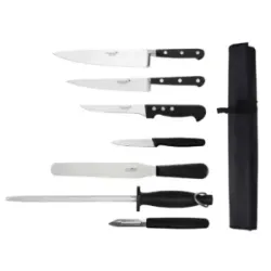 Chefs Knife, Utility Knife, Slicer, Fillet Knife, Boning Knife, Paring Knife, Tourne Knife, Carving Fork, Spatula, Steel, Melon Baller and Roll Bag