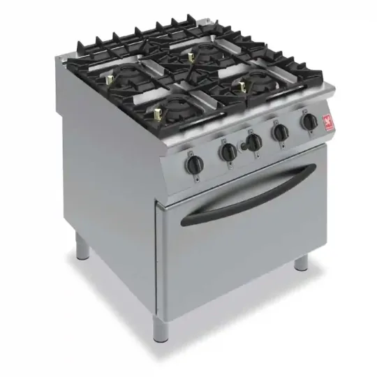 The G9184A four burner oven range is ideal for any kitchen. Two powerful 9.5kW burners and two 4.2kW burners, individual cast iron pan supports and manufactured from 304 culinary grade stainless steel ensures it can withstand the harshest of kitchen environments. A one-piece pressed hob with deep drawn wells that contain spillages, wide raised corners to prevent build up of grease and grime and sealed burner wells make the unit easy to clean and keep clean.