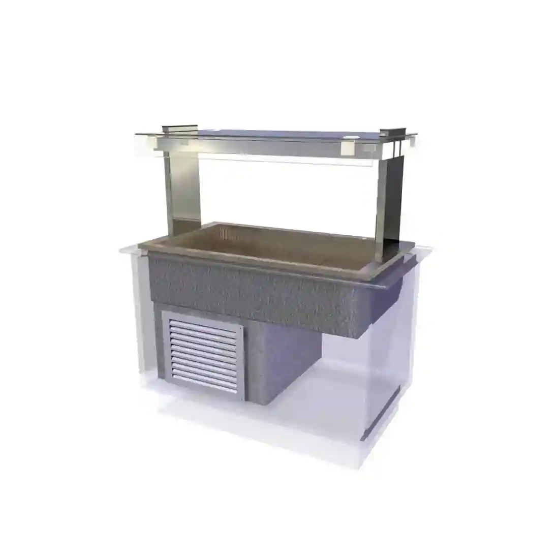 - Gantry fitted with flat toughened glass sneeze screen to each side of display, for food protection