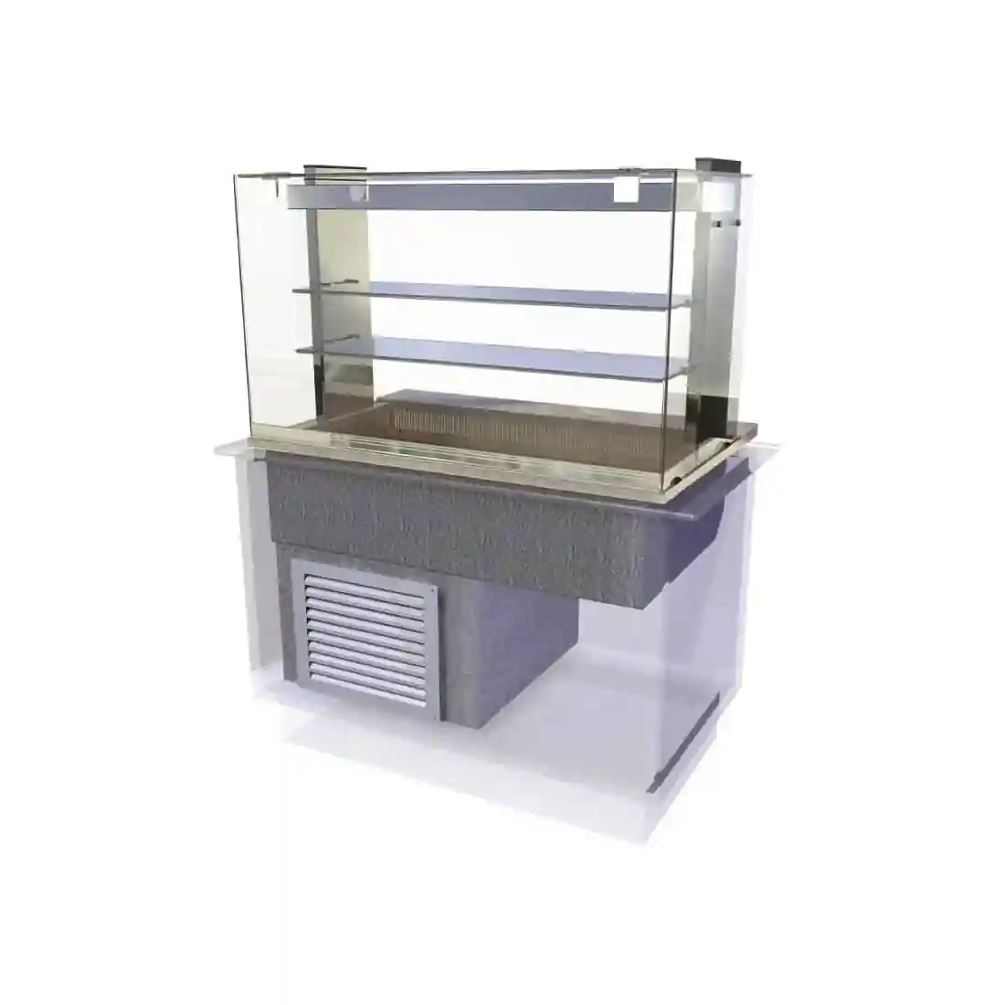 - Two additional ambient glass mid shelves provide additional merchandising space above the cold display area