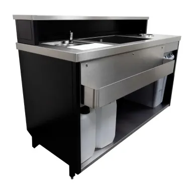 Transform any space into a professional service area with the EV-U Parry events bar. Designed as a comprehensive, all-in-one solution, the bar streamlines your mobile catering operation by providing everything you need in a single, stylish unit. It features an integrated ice well, speed rail, condiment tray, and chopping board, allowing staff to prepare and serve drinks with maximum efficiency. The smart, powder-coated front and sides are paired with a strong, easy-to-clean stainless steel top, ensuring both lasting durability and a professional appearance.