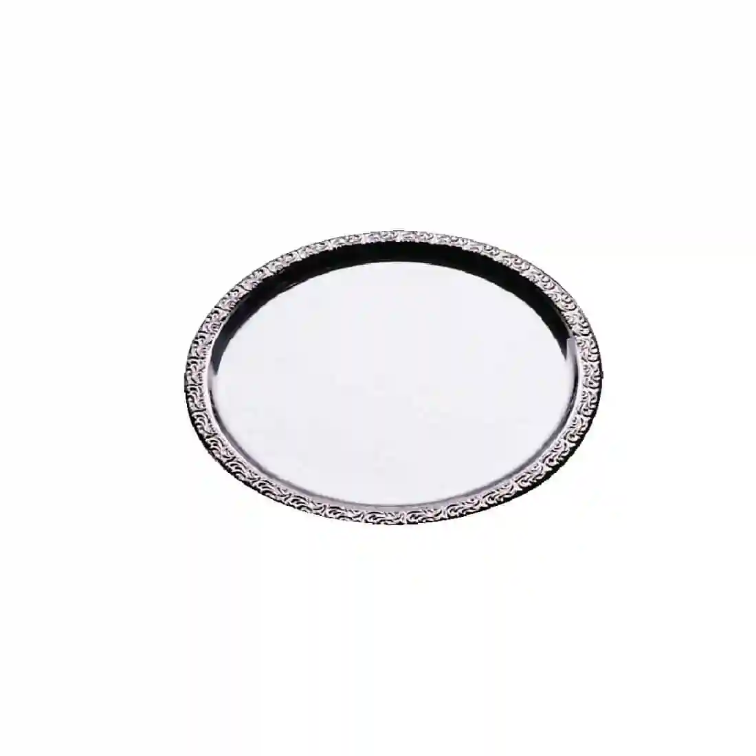 Ornate raised edge circular service tray.