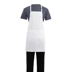 Polycotton white bib apron with adjustable neck length for a perfect fit with reinforced bib front and useful pockets, suitable for front or back of house use.