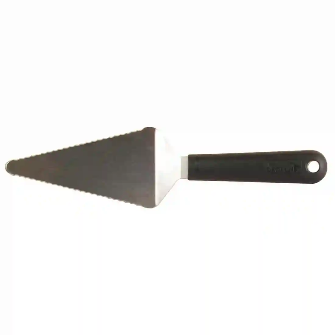 Slice and serve in one go with this handy stainless steel kitchen utensil. Has a serrated side for easy cutting.
