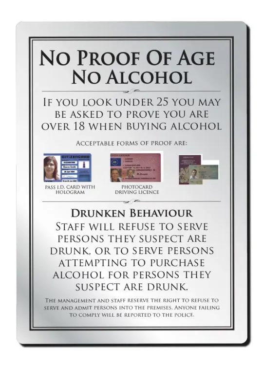 This bar sign displays a notice and images outlining appropriate forms of age identification. In addition to this, the sign also illustrates that staff reserve the right to refuse service to anyone displaying drunken behaviour.