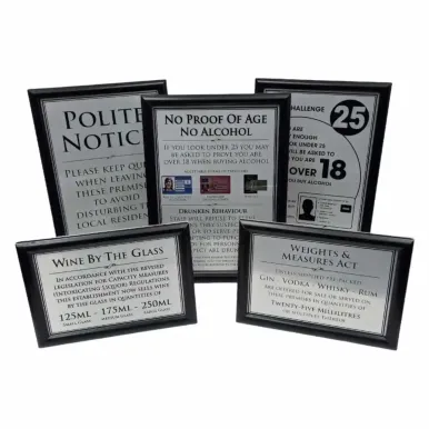 Maintaining a distinguished image must be considered in the realm of upscale establishments, such as pubs, bars, restaurants, and hotels. One hallmark of such establishments is their commitment to legal compliance and providing a good customer experience. At the heart of achieving these goals lies our meticulously crafted Framed Essential Bar Licensing Sign Pack—a curated collection of signage designed to enhance legal adherence and customer satisfaction.Aiding legal compliance: Navigating age verification policies