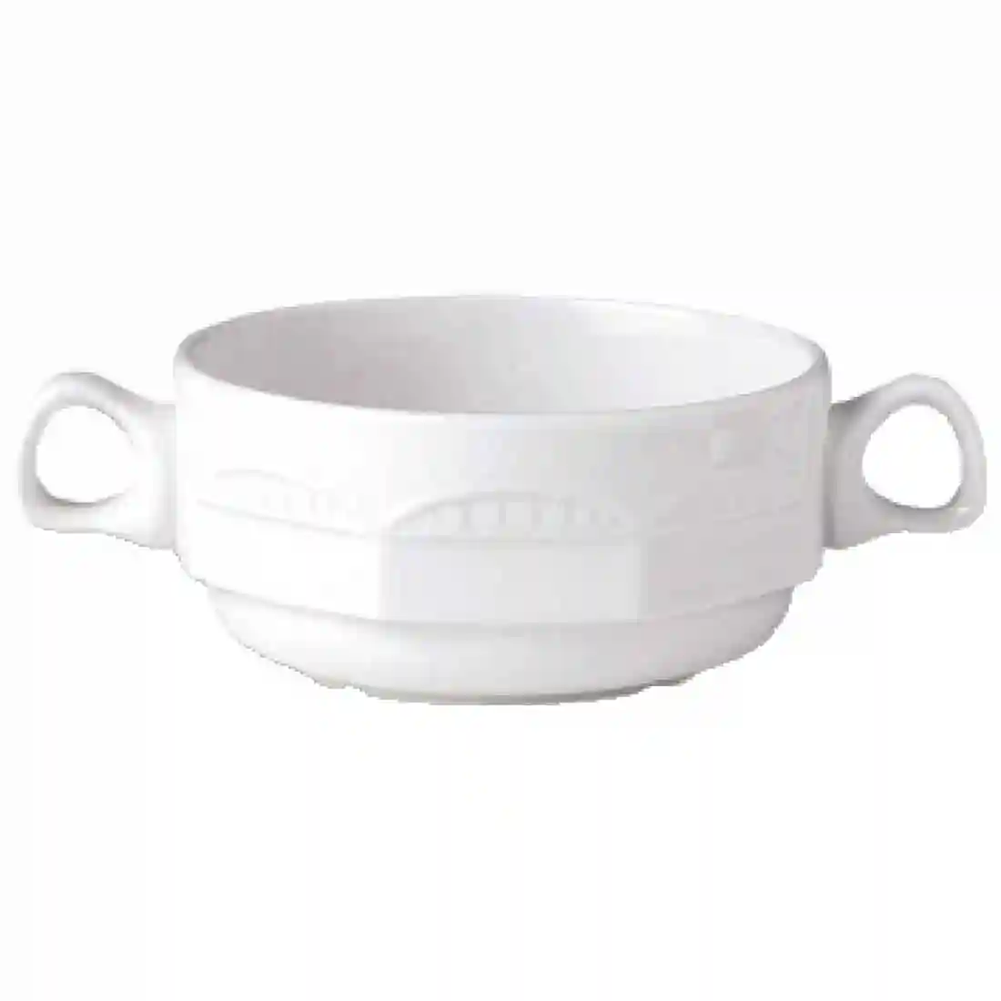 A distinctive hexagonal body and fine embossment gives this collection a timeless appeal, making it perfect for hotels, guest houses, cafes or tearooms requiring a sophisticated yet understated crockery solution. This 10oz, handled soup cup is a pure white in colour and made from a durable alumina vitrified body, making it able to withstand the rigours of daily use within the professional catering industry.