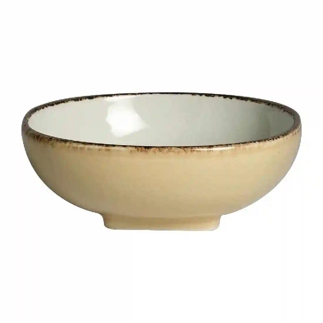 The warm, rustic style of this 5″ Tasters bowl in Wheat is complimented by its strengthened, durable alumina vitrified body. The Terramesa range is a response to the revival of colour on the table top, and the craft-inspired shades mirror the process of taking food ‘from earth to table’. The bowl is hand-finished with edges that carry a textured reactive glaze.