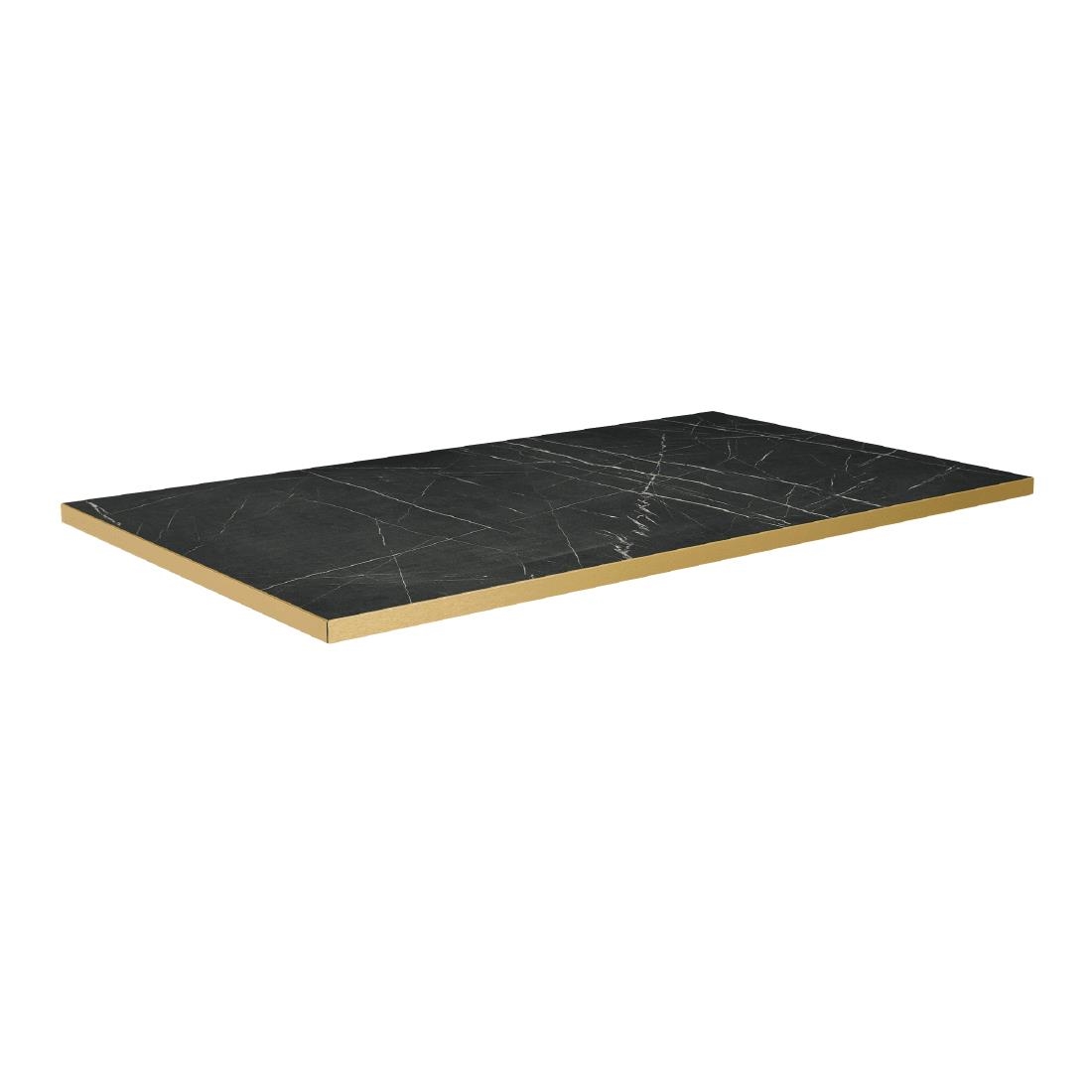 The perfect blend of style and durability, this Omega rectangular laminate table top is a great choice for busy hospitality settings. Its striking black Carrara marble-effect laminate features a 2mm gold ABS edging which contrasts with the distinctive design of the top. Designed and manufactured for heavy use, the 25mm thick contract-grade laminate requires little maintenance and is easy to wipe and keep clean.