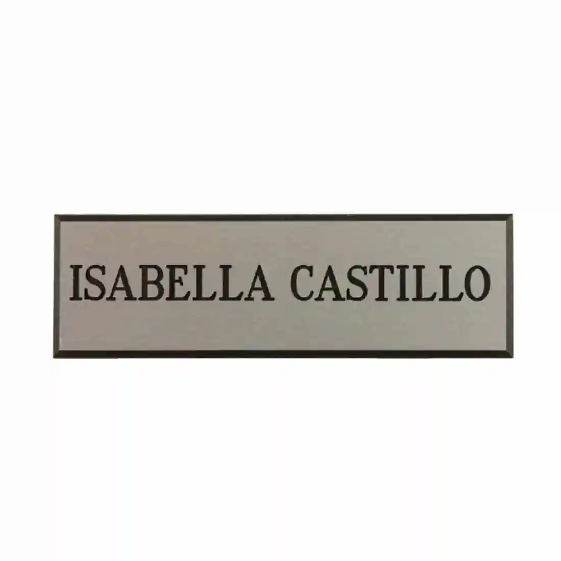 Silver name badge with black text. 23(H)x 70(W)mm