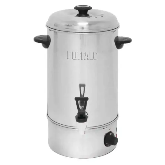 The Buffalo 10 litre manual fill water boiler is a powerful and versatile addition to commercial premises. Ideal for mobile caterers, B&Bs and staff rooms, the kettle is perfect for buffet-style breakfast service and businesses with limited access to mains water. The easy to clean, fully-welded stainless steel construction ensures that the urn is strong, water-tight and durable. With a powerful 2.6kW concealed element and variable temperature control, the Buffalo commercial boiler can be used to keep water below boiling if necessary. Supplied with sturdy handles to ensure the unit is portable and a non-drip tap which is robust and secure, the boiler is a valuable addition to any commercial catering establishment.